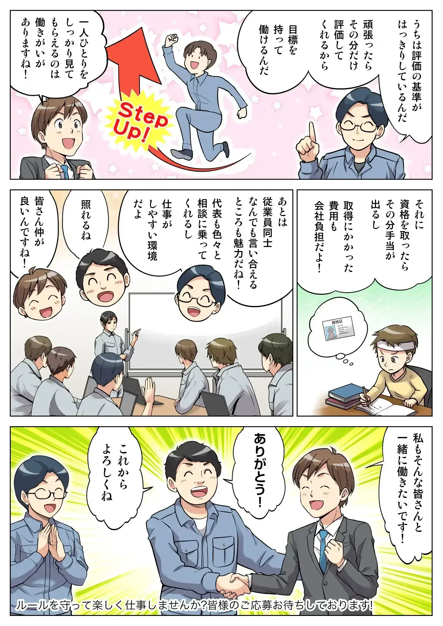 昇給・昇格の基準がしっかりと決まっており、あなたの頑張りを正当に評価いたします。能力やスキルが評価されずに今まで悩んでいた方は、ぜひ弊社にご応募ください。